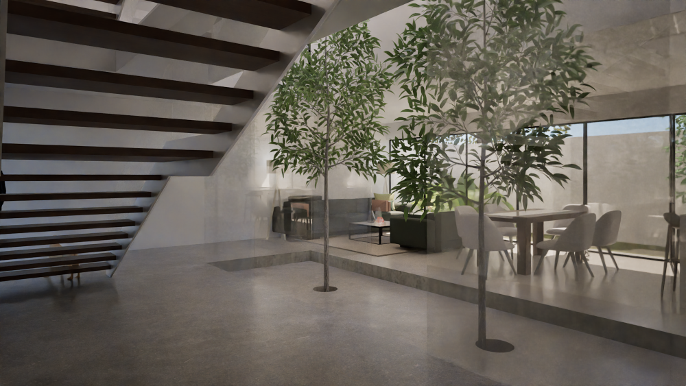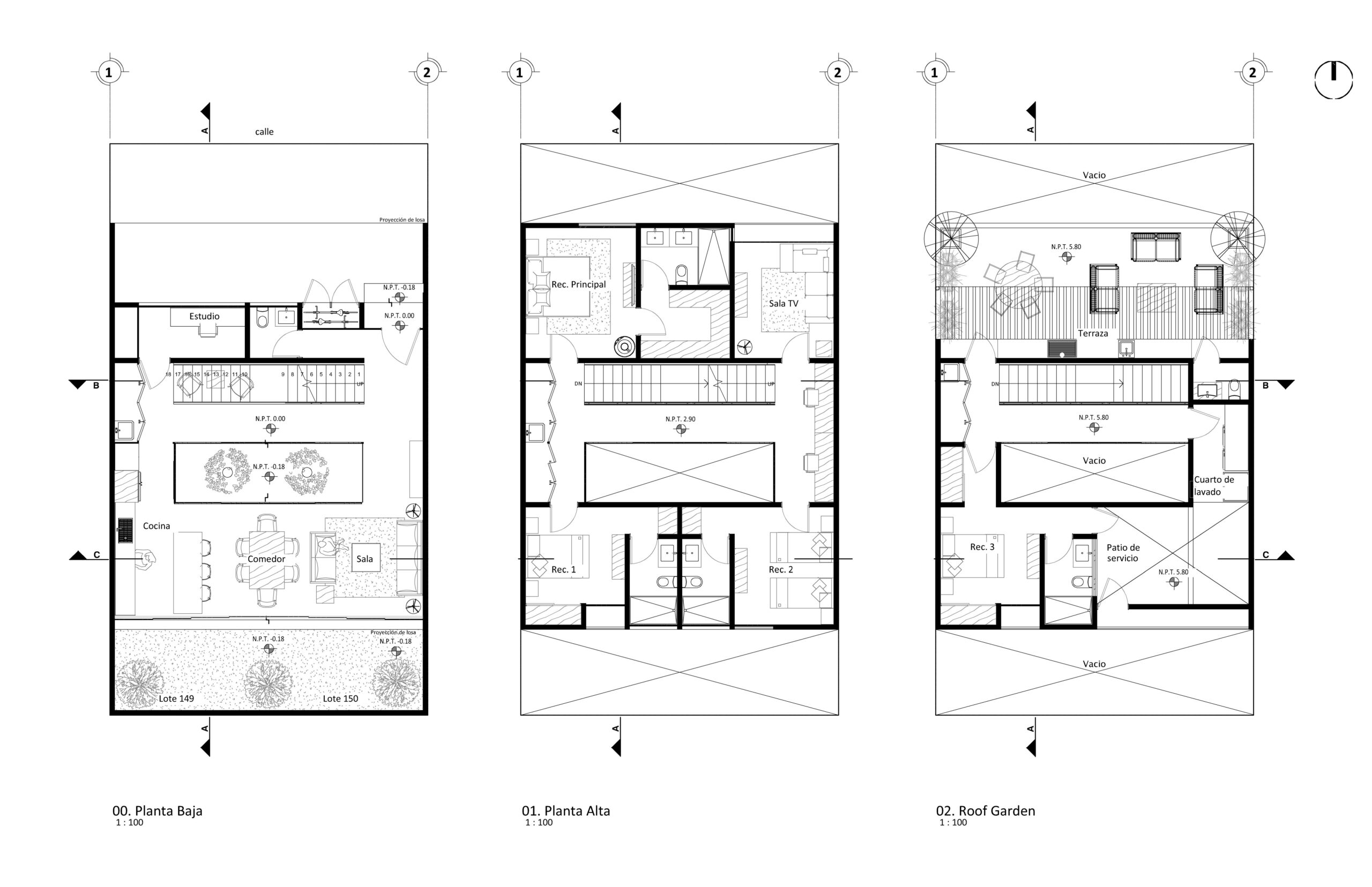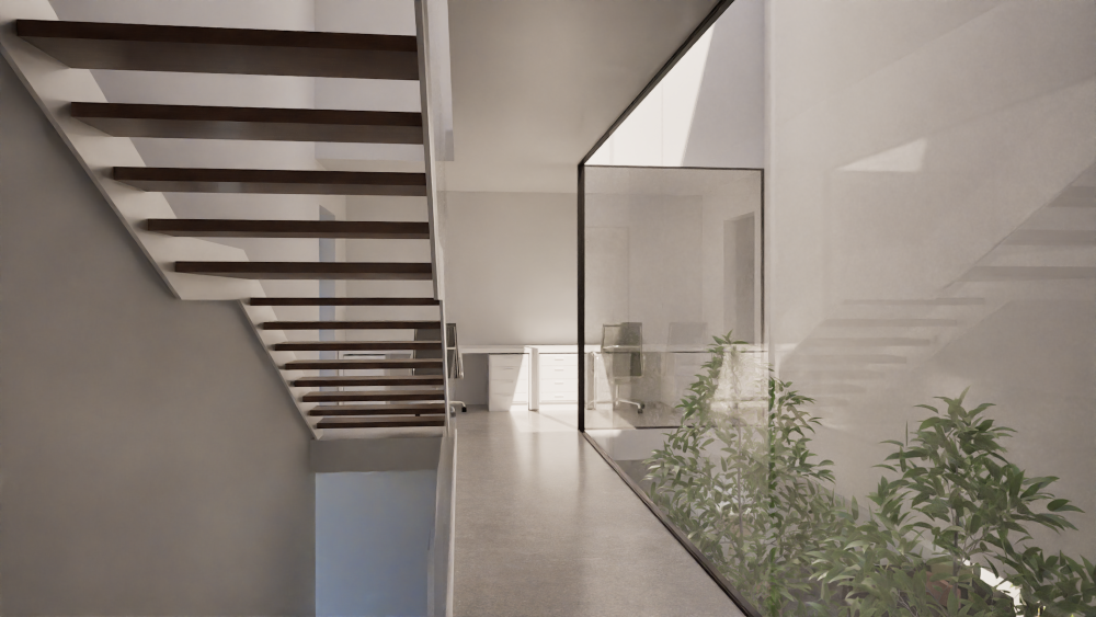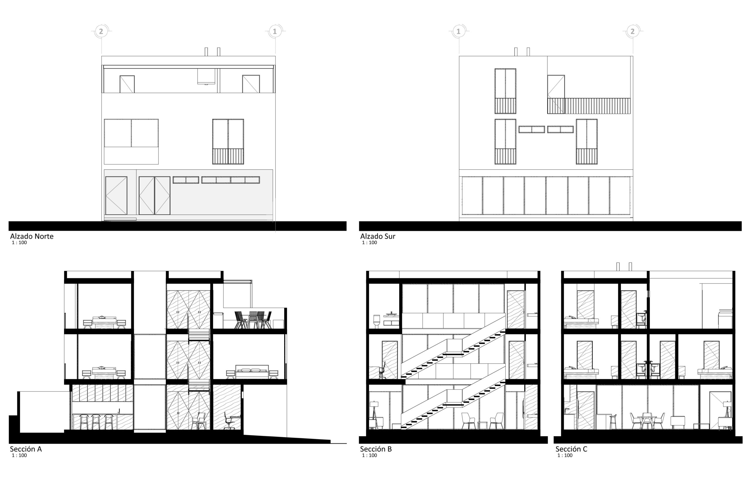 Proyecto habitacional unifamiliar con un complejo programa arquitectónico a cumplir. Se distribuye el proyecto en tres niveles ventilados e iluminados por un patio interior.