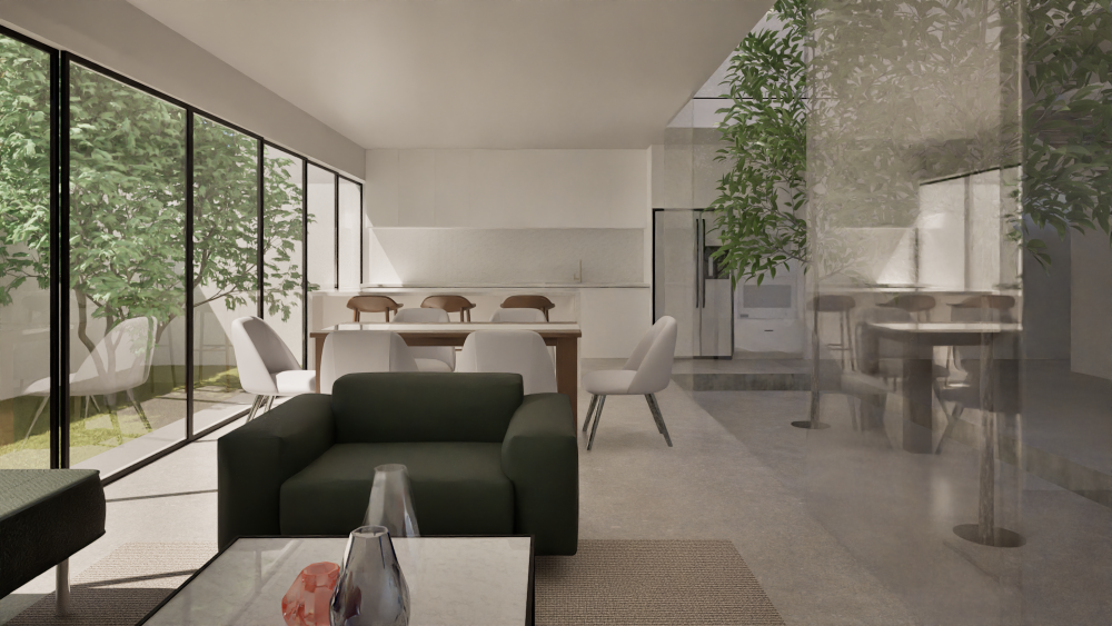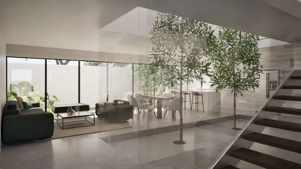 El cubo de luz interior genera una barrera física, delimitando áreas y dando privacidad a los espacios que separa.