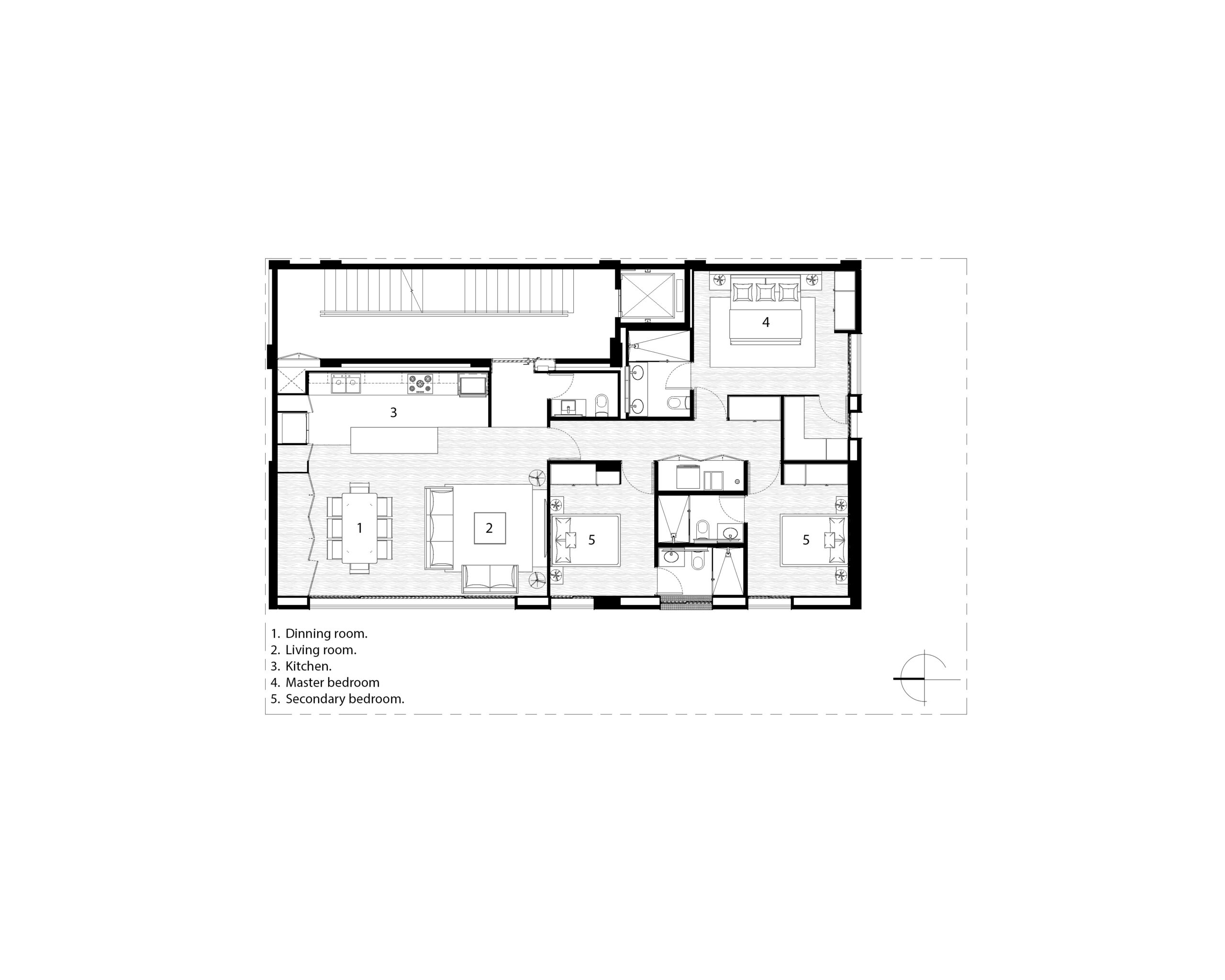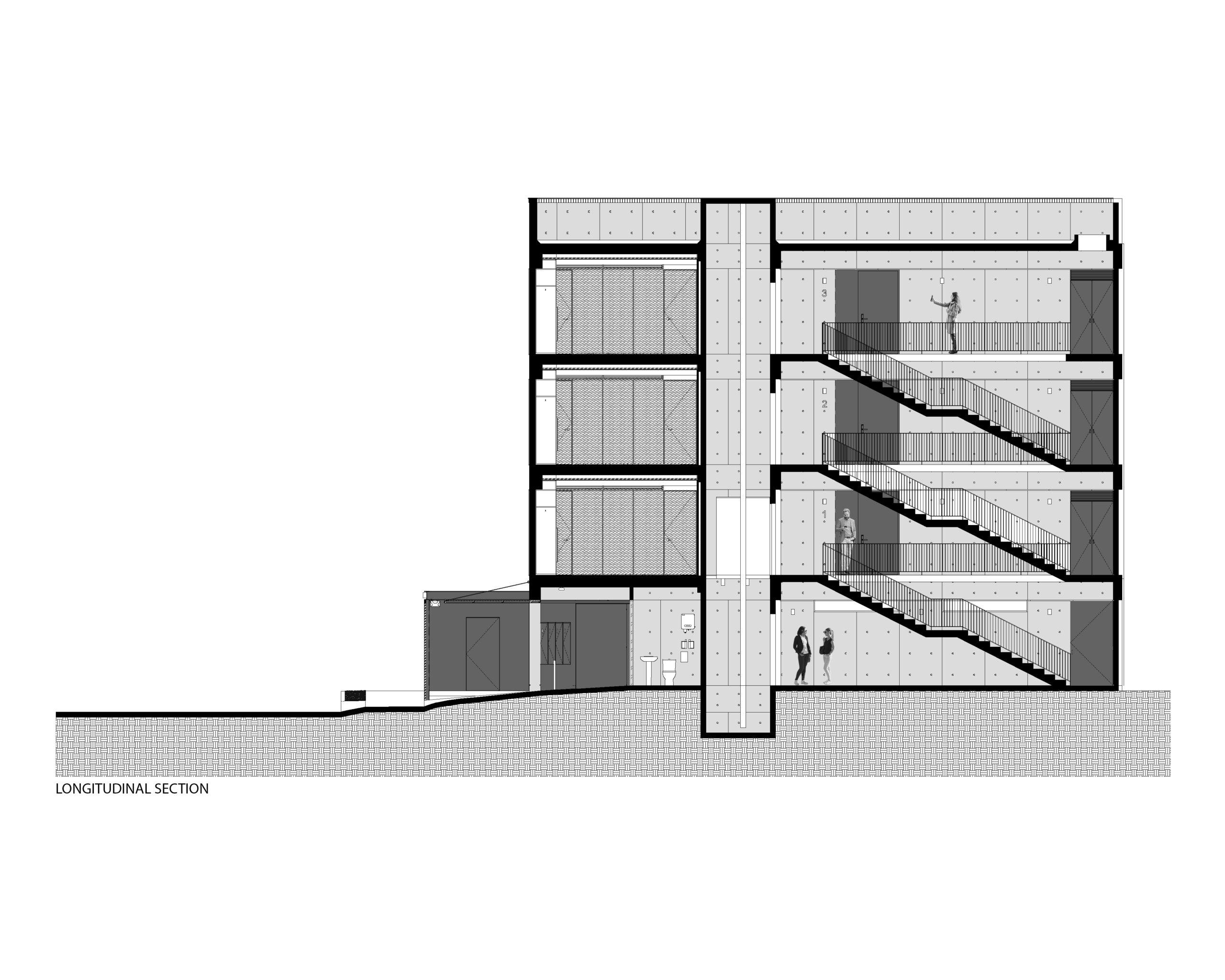La circulación vertical se resuelve mediante un cubo de escaleras ubicado al fondo del edificio, lo que permite liberar las fachadas principales y maximizar la iluminación natural.