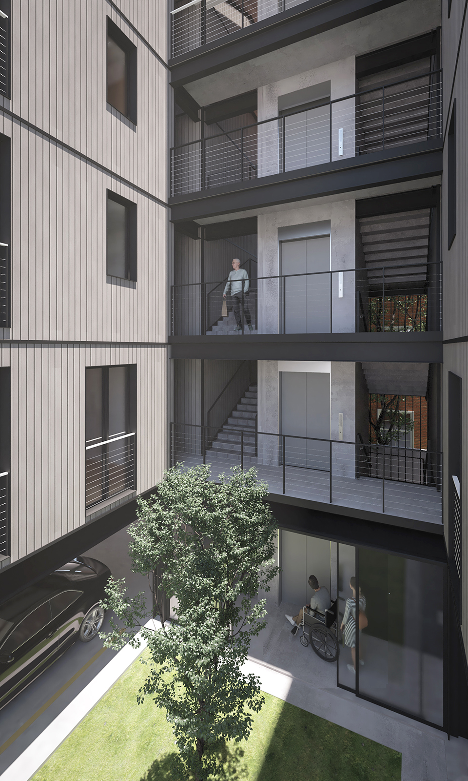 El edificio se organiza en torno a una única escalera central, que funciona como columna vertebral del proyecto, complementada por un ascensor para garantizar accesibilidad universal. Un pasillo central conecta todos los apartamentos, permitiendo el ingreso de luz natural a lo largo de todo el edificio.