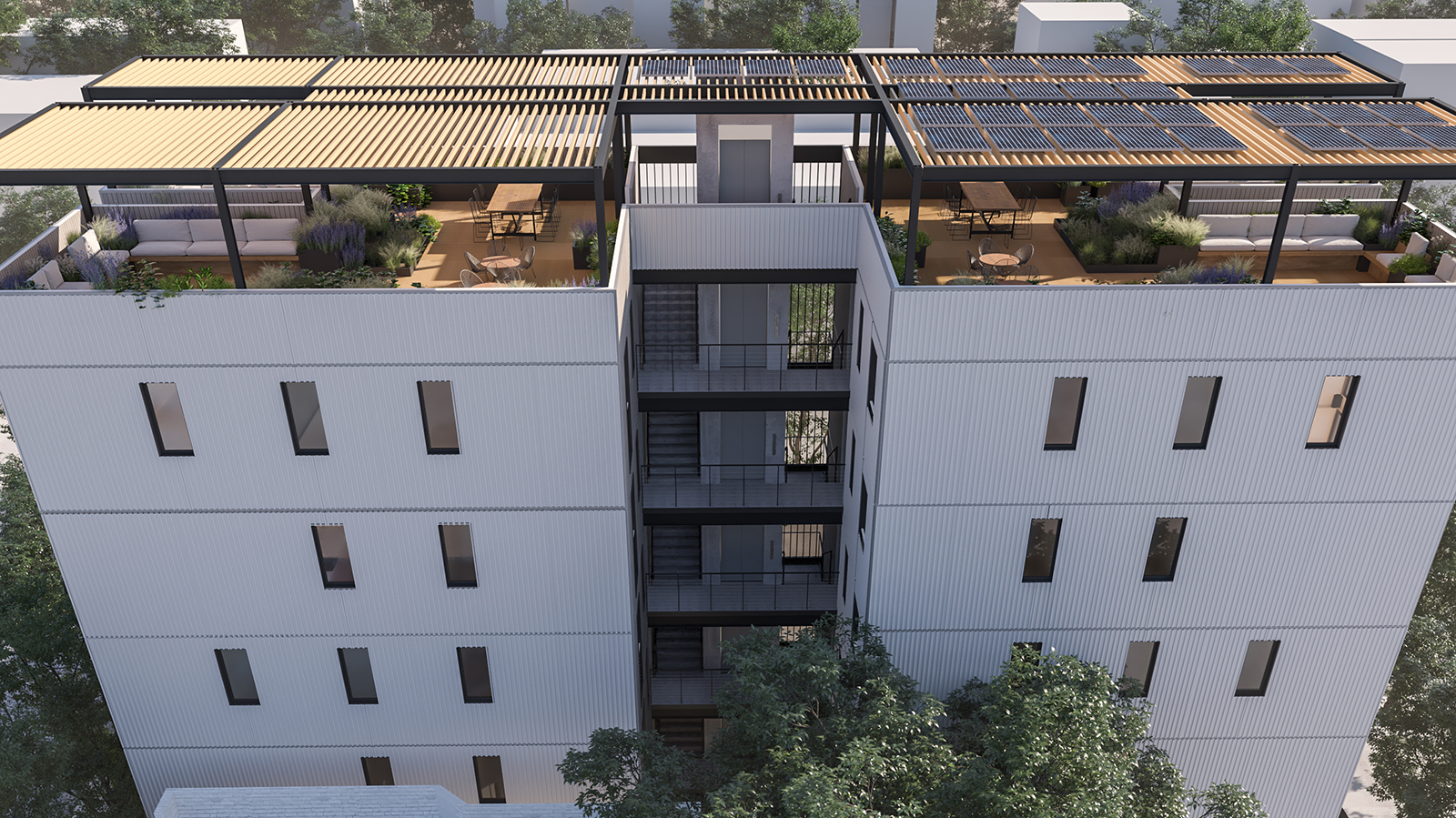 Finalmente, el edificio incorpora una cubierta verde común tipo veranda, donde se podrán instalar paneles solares, fomentando el ahorro energético. El uso de materiales resistentes y de fácil montaje permite una construcción prefabricada, reduciendo costos de mantenimiento y riesgos como el incendio.
