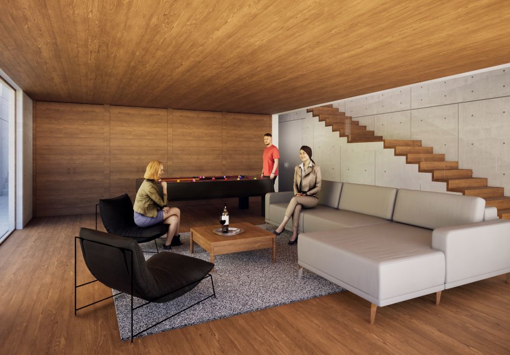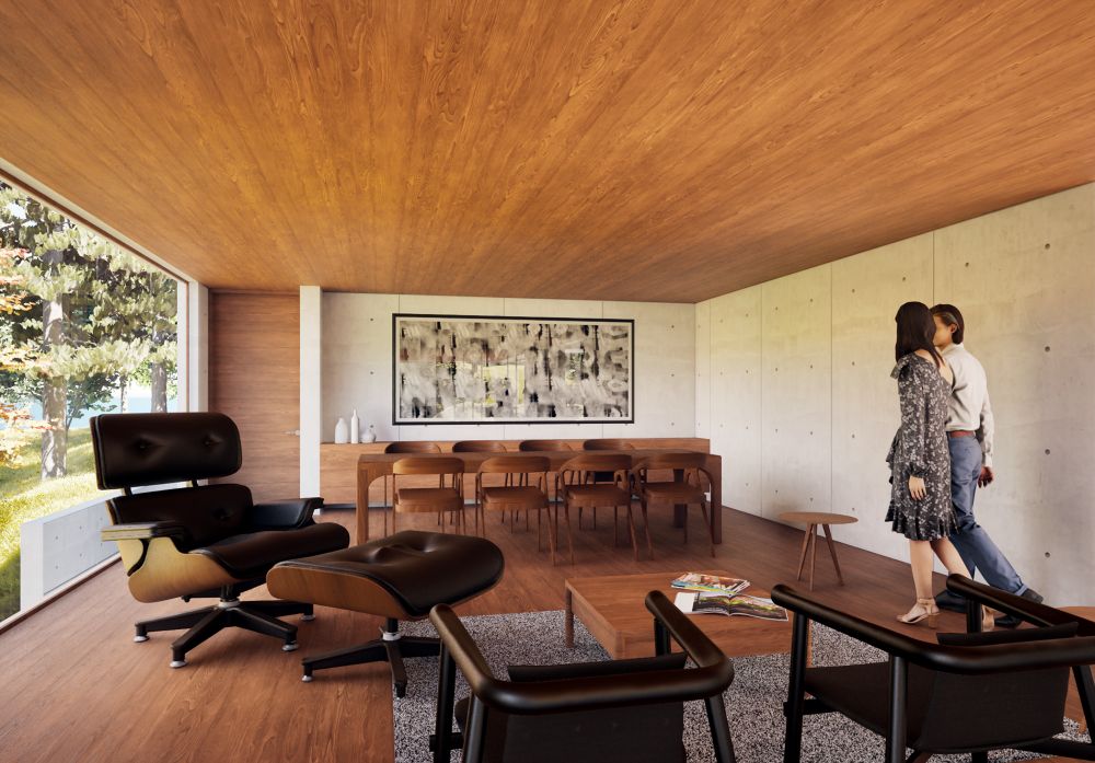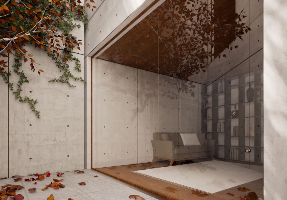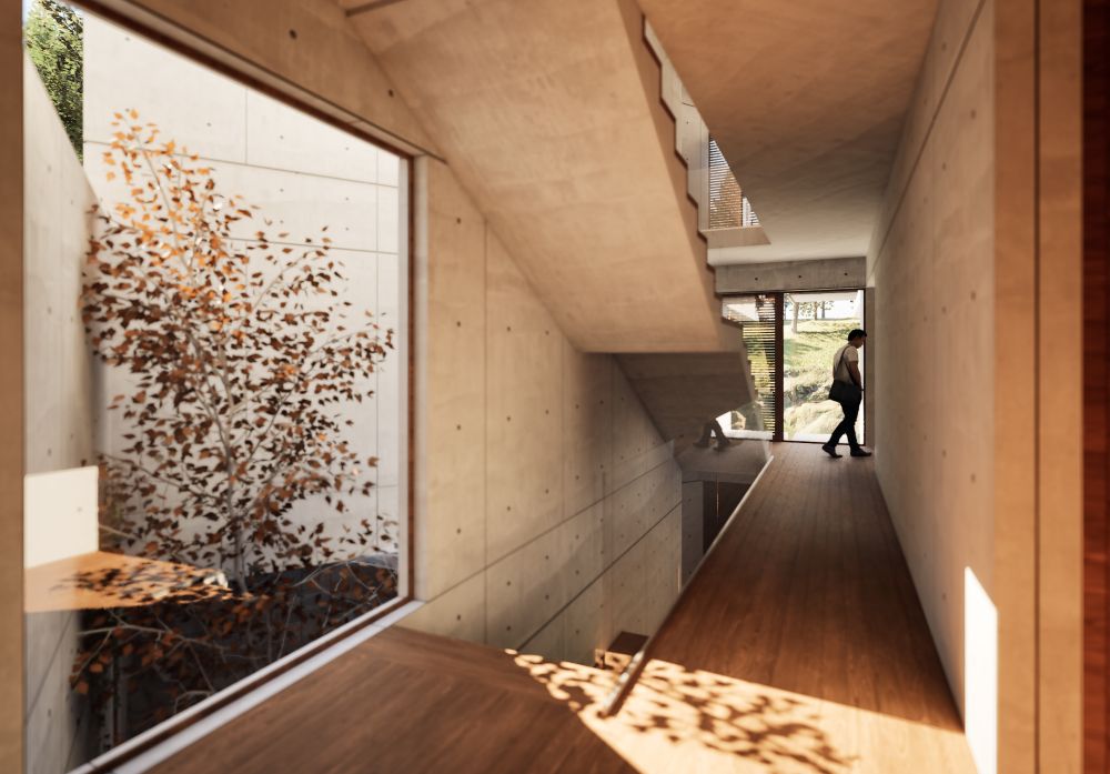 El volumen principal de la casa se alinea con la cascada, mientras que una pequeña habitación y un estudio miran hacia el lado opuesto. El volumen principal alberga la entrada, la despensa, la cocina, el comedor, las salas de estar y las circulaciones. Las escaleras son la columna vertebral del proyecto y guían al visitante a través del mismo hasta el río.