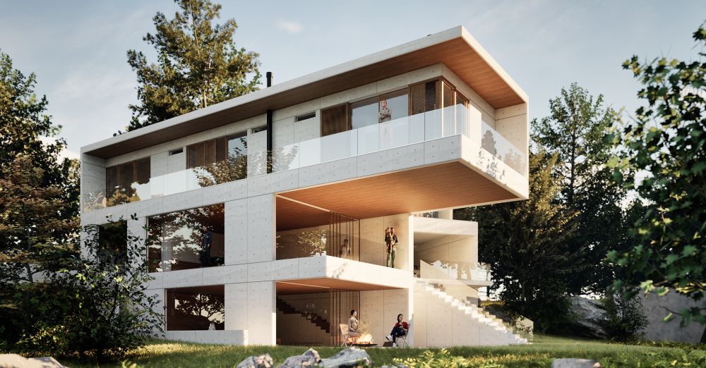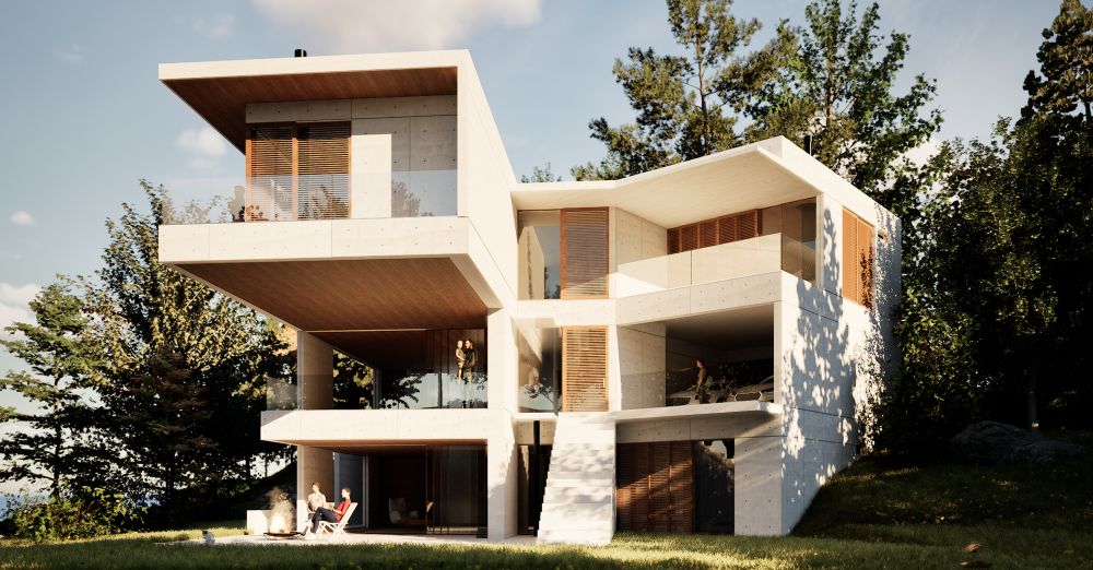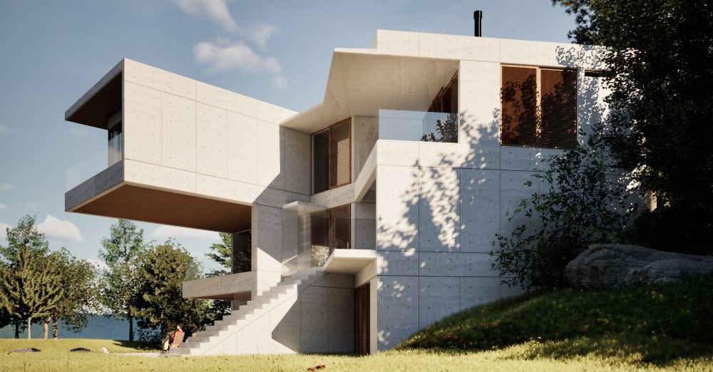 Un gran voladizo se inclina hacia la cascada creando una impresionante terraza. Permite que el ala principal tenga una vista espectacular del sitio, a la vez que enmarca el paisaje. Se utilizó hormigón visto, cuidadosamente modulado para brindar claridad y rigor estructural.